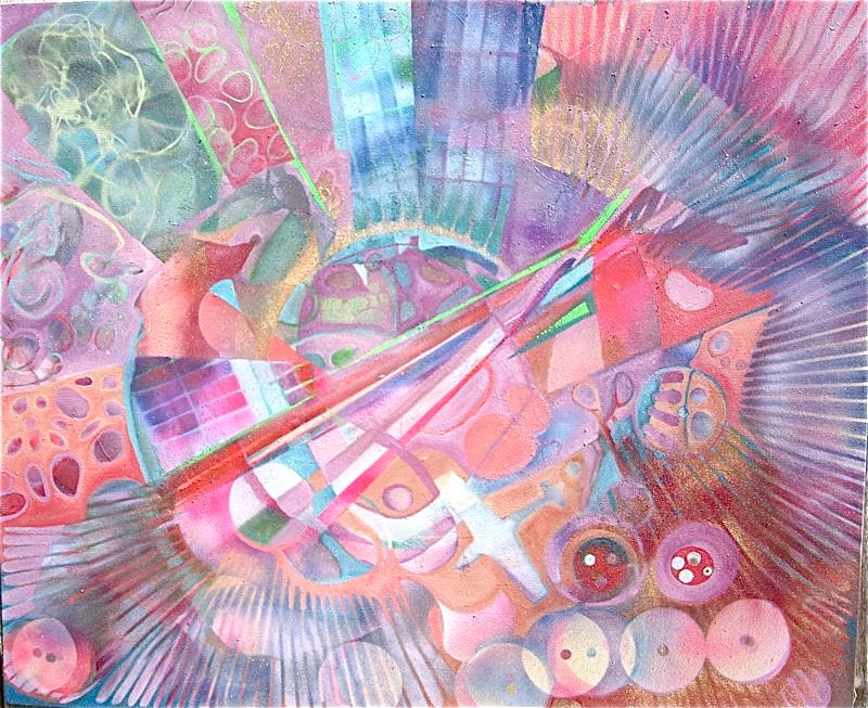 “In August of 2012, scientists discovered the Higgs-Boson Particle at the Cern Large Hadron Collider. In reading about the discovery, I exploded with an exaggerated and dramatic energy like a blast, and the result is the series titled “Higgs-Boson”. Within the layers of painting are recognizable objects; these are taken from a massive junk drawer, like matter forms into mass. From tools, rubber bands, a broken strand of pearls, they are a clustered outer expansion around refracted light. Eventually, the energy from the Higgs Boson will dissolve; die off and be as short-lived as the particle itself.