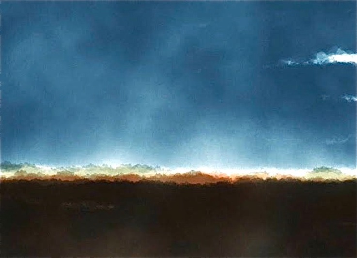 “The Texas countryside entered my awareness about that time too; I was driving south each weekend to be with the one who holds my heart, and leaving work at 5, I'd drive through the sunset where I'd see the clouds get dark and the laser light of the sun on the horizon separated the earth and sky. Sometimes a stand of trees would be in silhouette; sometimes the understory of the tree canopy would leak orange light as the sun set. This big sky, big sunset, big landscape became a major subject of my work. I drove south each friday and north on sunday; often in that time, I’d see wildfires and smoke from distant fires. These fire scenes made a big impression; lines of smoke and fire would fill most of the panorama of landscape. I'd never seen anything that big before. The news photos about Bastrop's fire were similarly startling.